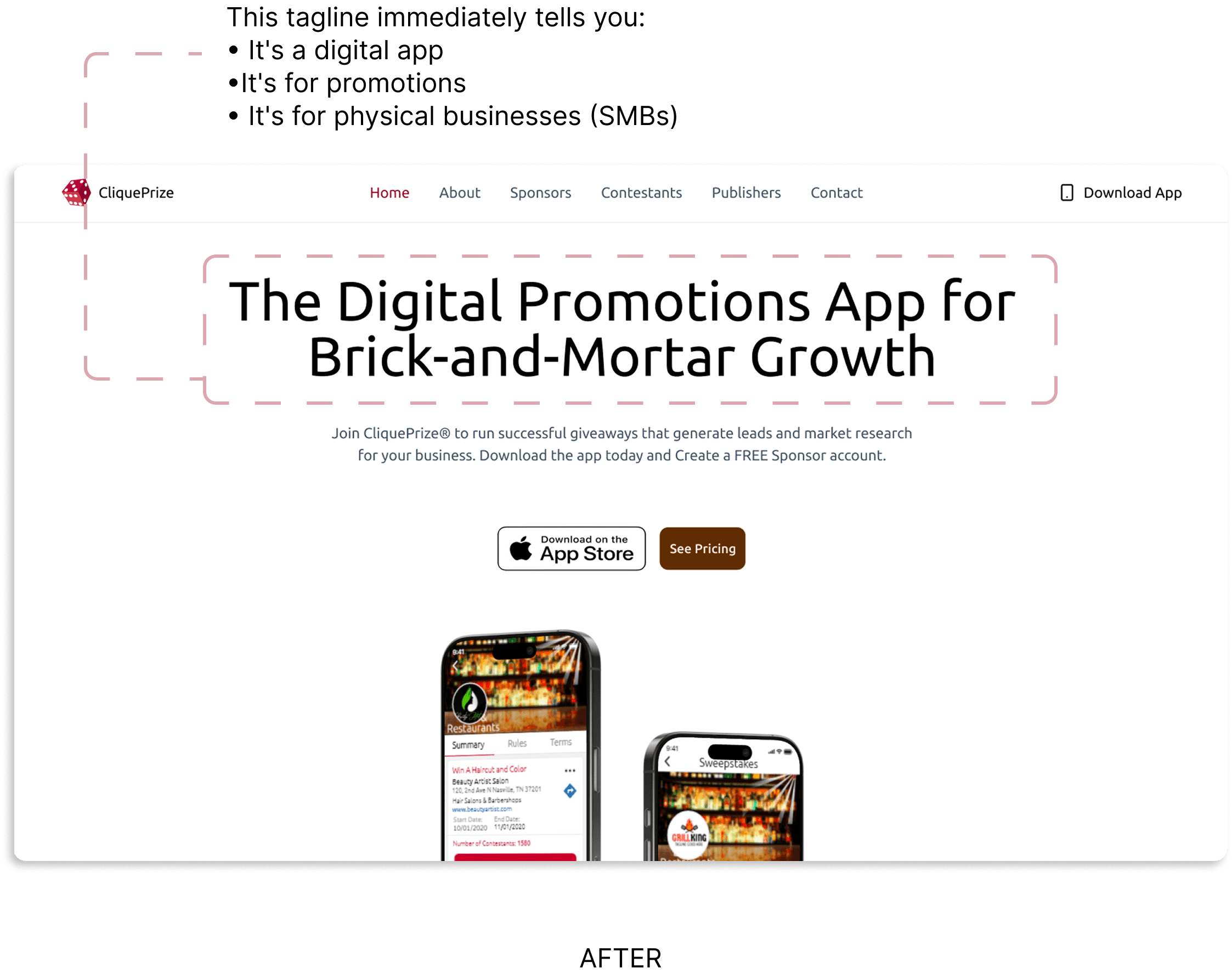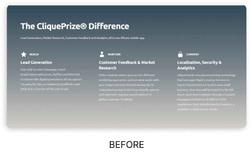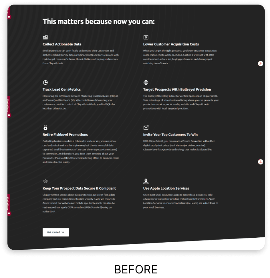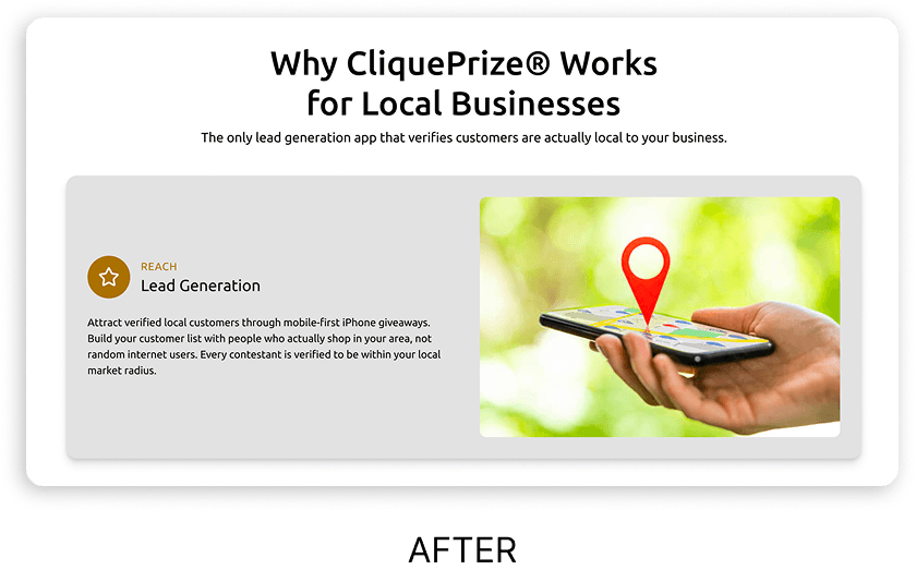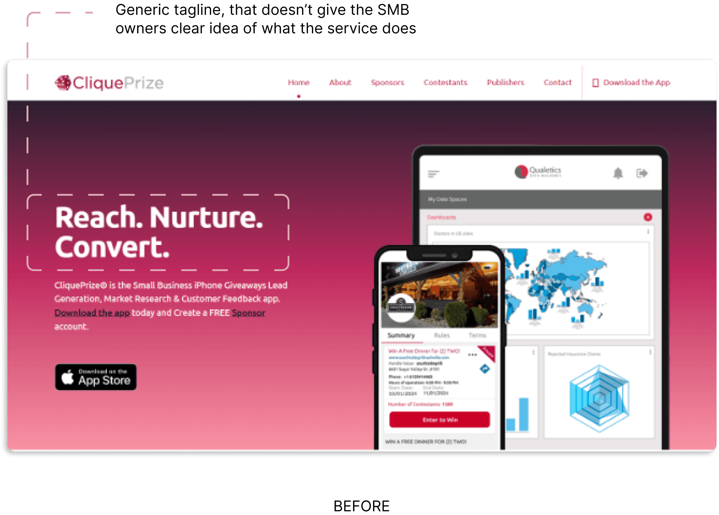 CliquePrize's marketing website wasn't connecting with its core audience: small business owners. I redesigned the entire site to speak directly to their pain points, replacing vague messaging with clear value propositions.
