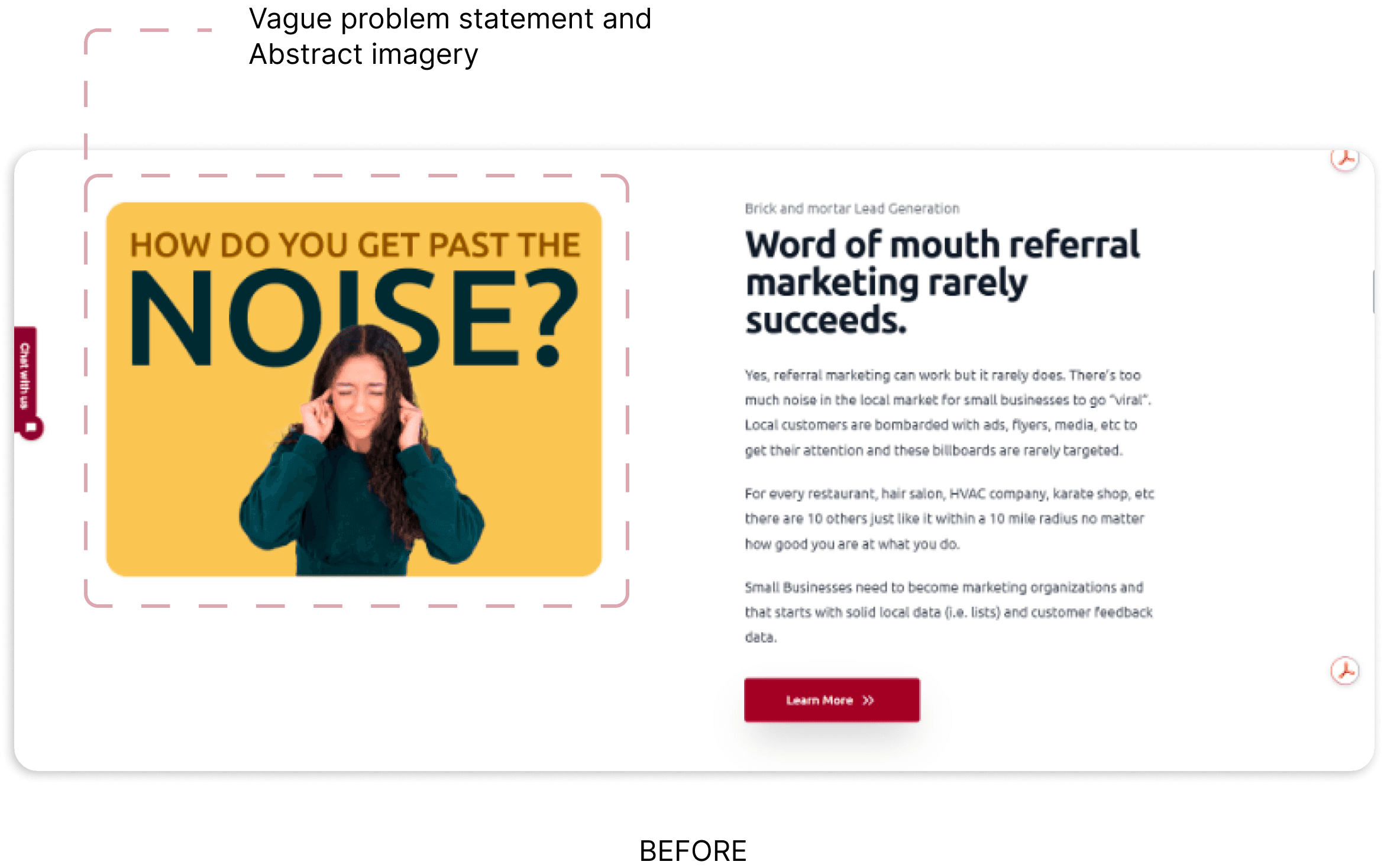 In user research with small business owners, I found they don't think in abstract terms like "noise", they think in concrete business challenges: foot traffic, local competition, customer retention. Competitors like Toast and Shopify ground their messaging in specific, tangible problems their audience faces daily. This reframe makes the problem immediately recognizable and creates stronger emotional resonance with the target user.