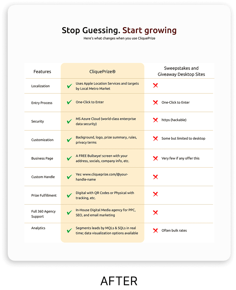 Instead of the blocks of text explaining why CliquePrize stood out, I designed this table to highlight CliquePrize's unique advantages (like geo-targeting) while being honest about feature parity where it exists, building credibility rather than making exaggerated claims.