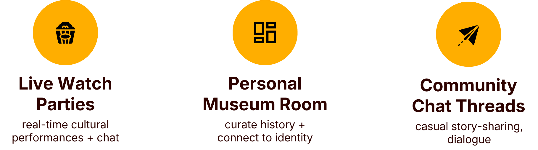 Safe, moderated spaces where users discuss performances, share family stories, and ask questions of historians, recreating the trusted learning environment 64% of Black Americans prefer.